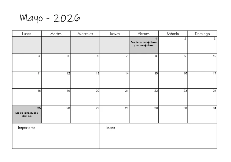 Calendario organizativo 2026 con todos los feriados. Ideal para docentes y estudiantes. Diseño listo para imprimir.